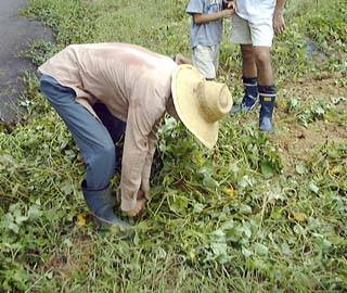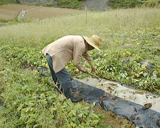 ツルが切れたところから、かぶせていた黒いビニルをはがしていきます。 これもけっこう大変なしごとなんですよ。 |
