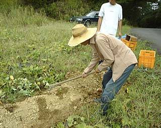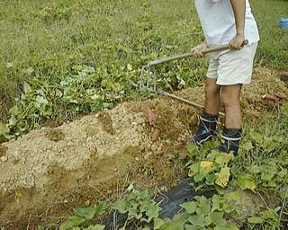 やっとイモが植えてある「うね」が見えてきましたね。 これから、一株(かぶ)ごとにくわを使ってほっていきます。 |