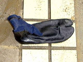 これがうわさの「田植え足袋(たび)」です。田植え専用の地下足袋(じかたび)です。 底がゴムで足首の辺りはくつ下のようになっています。 これのかっこいいのをウィンドサーフィンなどで使っていますよね。(^^ゞ 今年も、農家の店「し○し○」で980円でした。 |