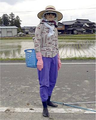 5月28日(日)晴れ!! 今日は6時に起きて、準備(じゅんび)OK! これが今年の流行している「ミレニアム田植えルック」です。??? 日焼け防止(ひやけぼうし)のために麦わらぼうの下にもう1つぼうしをかぶっています。 手も日焼け防止と手荒れ(てあれぼうし)のためにビニル手ぶくろをはめています。 もちろん、真っ黒のサングラスもかかせません。 腰(こし)にさげたイネの苗入れのかごがおしゃれですね。 モデルは、Pちゃんのお母さんです。 |