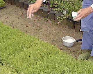 田植えをする前に苗の消毒をします。イモチ病などにきく薬をパラパラとふりかけています。 あまり使いすぎると川に住む生物にわるい影響(えいきょう)がありますので、決まった量(りょう)より多くは使わないようにします。 |