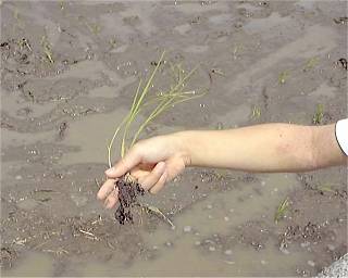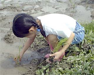 イネの苗(なえ)はこのように指(ゆび)ではさんでもちます。 Pちゃんもなかなかよい手つきになってきました。 |