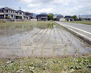 やっと田植えが終わりました。きれいに苗が植えられているでしょう。 すくすく育って、9月に稲刈り(いねかり)ができればいいなぁと思っています。 |
