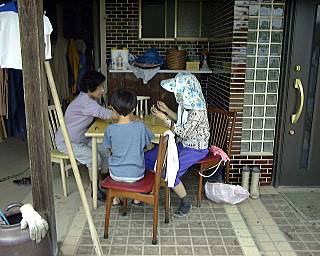 これが農家のお昼ごはん風景です。 足がどろどろなので家の中に入ることができません。そこでこのように庭先で食事をします。 じゃあ、トイレはどうするって? これは外ではできないので、田植え足袋(たび)の上からビニルぶくろをかぶせて家の中のトイレに入るのです。 |