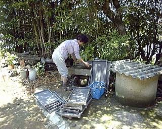 昼ごはんのあとは後かたづけです。 これは苗ばこをあらっているところです。きれいにして、来年また使うときまでしまっておくのです。 |