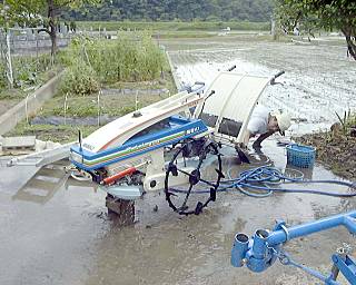 田植機を使って植えていきます。 まっすぐに植えるのはむずかしいです。足下をばかり見ていると田植機はクニャクニャいがんでしまいます。 田植機は80万円くらいします。10年間は使えるそうですが、1年で使うのは田植えの日たった1日だけです。 ですから、田植え1回で約8万円かかるのです。 |