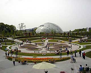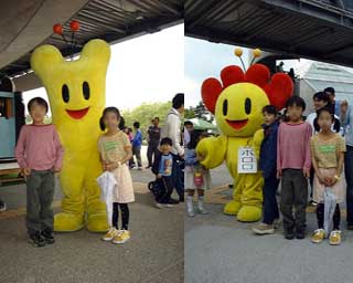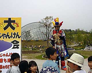 | まず、第1は・・・「とっとり花回廊(はなかいろう)」で見つけたおもしろいもの、イベント広場で行っていた「大じゃんけん大会」です。ちょっととぼけた、じゃんけん星から来たじゃんけんマン。勝ち進んでいけば、マスコットのポロロとピロロの人形がもらえるということでした。 ちなみに、Pちゃんは1回戦で、お父さんは3回戦で負けてしまいましたので、賞品はありませんでした。(^^ゞ |