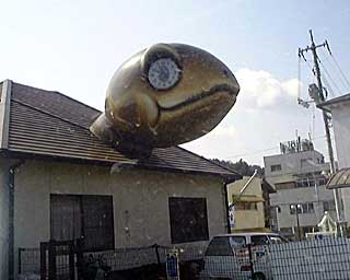 JR岡山駅からJR津山駅の間に、亀甲(かめのこう)という駅があります。 名前の通り、駅舎(えきしゃ)の屋根に大きなカメの頭がついています。もちろん、うらがわにはしっぽが・・・ドアが閉まったので写すことができませんでした。ざんねん!(^^ゞ |