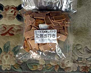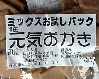 | 岡山県津山市から国道181号線を通って「とっとり花回廊」に向かうとちゅうに、岡山県真庭郡(まにわぐん)新庄村(しんじょうそん)というところがあります。ニューヨーク・メッツの新庄選手の出身地ではありませんが、同じ名前ということで、平成5年11月より村をあげて新庄選手を応援(おうえん)しています。平成10年12月13日には「新庄選手と夢のクリスマスの集い」を開いたそうです。 上の写真は、新庄選手がついたモチを手軽に食べられるようにと作った「必勝5穀(こく)おかき」のパックです。阪神フアンのお父さんとしては、要チェックの一品です。 |