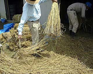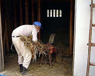 | となりのおじさんが牛のエサのじゅんびをしているところです。 切ったワラをさらに細かくしてエサとします。 ここで育てる牛は、子どもを産まない若い牛で、数ヶ月大きく育ててから売りに出すそうです。 |