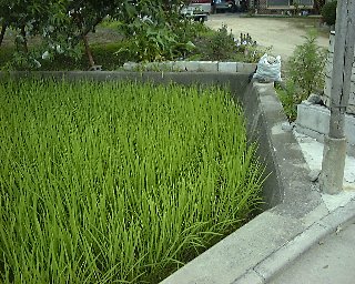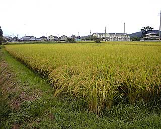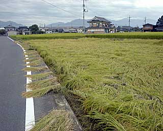 | 左がおじいちゃんの田んぼで、右がおとなりの田んぼです。 おじいちゃんの田んぼのイネはほとんどたおれていますね。 これは、上の写真のように、イネの穂(ほ)がたくさん実って重くなったことや、イネの種類がたおれやすいコシヒカリだからです。 コシヒカリはおいしいのですが、背(せ)が高くなり、実るとたおれやすい性質があります。(別名:コケヒカリ) となりの田は日本晴という品種が植えてあります。 |