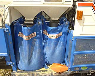 上の写真を比べてください。どうですか、きれいに刈り取られているでしょう? 手で刈ったイネはコンバインに通しながら脱穀(だっこく)していきます。あちらこちらに転がっている青いふくろがモミがいっぱい入ったふくろです。 これを集めて乾燥機に入れておしまいです。 |