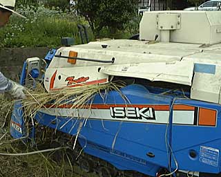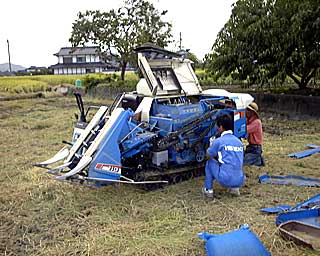 ここで大ピンチ! 問題が発生しました。倒れてしめっているイネばかりを刈っていたので、ついにコンバインの中がつまってしまいました。 しょうがないので、コンバインの会社方に来てもらいました。これでまた時間が・・・ |