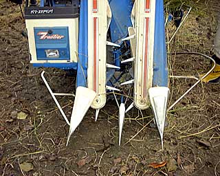 左上の写真のように、ヤリのようなものでイネを起こし、キバのようなツメでどんどん奥へイネを運びます。 右上の写真のようにバリバリとイネをのみこみ、左の写真のふくろの中にモミの部分だけをつめてくれます。 |