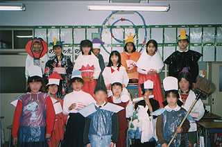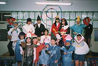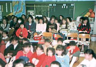 | ひなだんは机を積み重ねて作りました。この日は授業参観日で、たくさんの保護者の方が目の前におられるので、子どもたちはちょっと緊張気味でした。 また、子どもたちの後方中央に見える青い二重の円は、「教室を宇宙に」に出てくる北の空の星です。少し見えにくいですが、円の中心には北極星が見えるはずです。 |