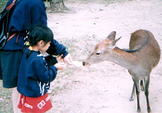 | 昨年の秋、奈良公園へ「正倉院展」を見に行きました。 初めて鹿にふれるPちゃんは、おそるおそる鹿にせんべいをやっています。 腰の辺りにこわごわの感じがよく出ているでしょう? |