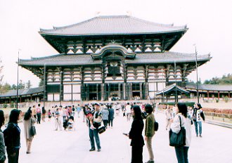 | 東大寺の大仏殿前でのショットです。お母さんカメラマンの構図はどうも難ありですなぁ・・・。 ちなみに、真ん中で小さく写っている2人がPちゃんとお父さんです。 |