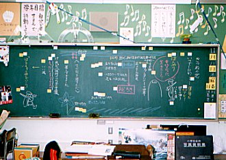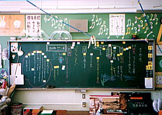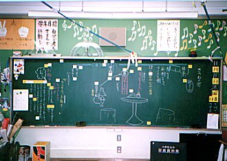 | これは何の変哲もなさそうな教室の写真ですが実は、大変な秘密があるのです。??? 黒板の上に見える怪しげな青いテープ・・・これが問題です。 この写真では全体が見えませんが、この青い荷造り用テープは、つりのテグスで天井にはりめぐらされております。6年生の理科の教科書に載っている半天球の図をイメージしてください。 そのテープの上に、今夜見えるであろう星座を画用紙で作ってはってあるのです。ですから、教室の中央から上を見れば、教室がプラネタリウムに早変わり!! |