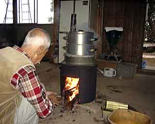 今から20世紀最後のもちつきです。 なぜ30日につくかというと・・・ 31日につくと「一夜かざり」と言ってえんぎがよくないからだそうです。 おじいちゃんがもち米をむすために火をたいています。 |