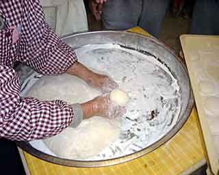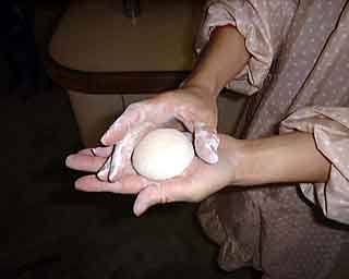 ひねり出したもちを手で丸めます。 このような手つきで丸く形を作り、手のひらで形をととのえていきます。 |