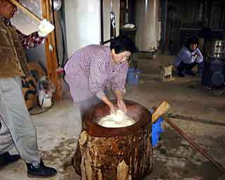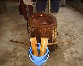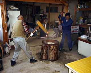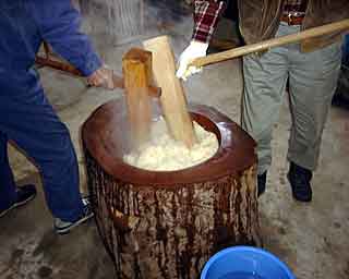 そのままではつけないので、「きね」でこねていきます。 もち米がつぶれて、飛びちらないくらいまでこねていきます。 |
