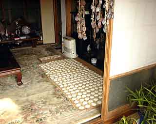 丸めたもちはPちゃんたちがはこんで、むしろの上にきちんとならべます。 上の方に見えるのは「つるしがき」です。これもお正月のかざりに使います。 |