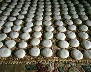 つけたもちはおぼんにとります。白く見えるのは米のこなです。 |