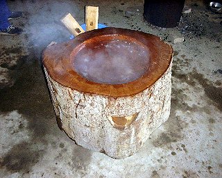 もち米がむせるまで、「うす」をおゆであたためておきます。木の「うす」って、今ではめずらしいでしょう? |