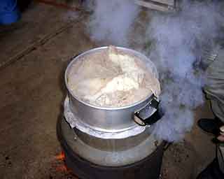 ゆげが出てきました。中まできちんとむせてくるとOKです。 なかなか火かげんがむずかしいようです。 |