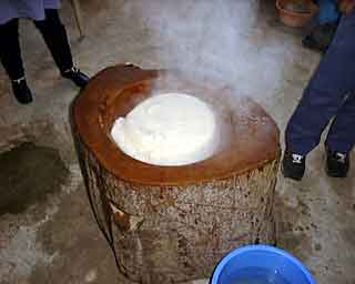 むせたもち米を「うす」にうつしたところです。 かなり熱いです。 |