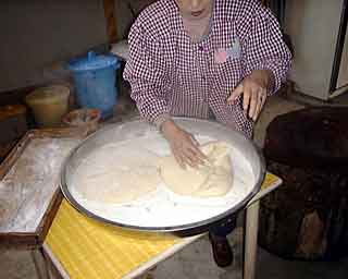 もちのかたまりから小もちの元をひねり出します。かんたんなようで、これがなかなかむずかしいワザなのです。 どのもちも同じくらいの大きさにするのって、けっこうたいへんです。 やはり、おばあちゃんが一番じょうずです。 |