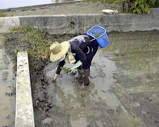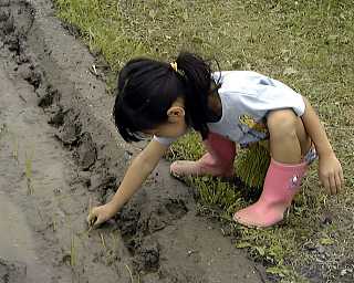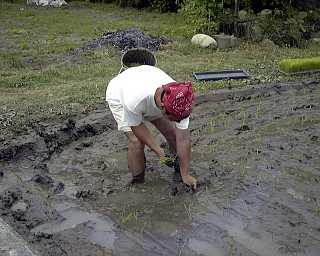お父さんが手で植えているところです。田植機を使えば? 田植機は便利なのですが、はしの部分やUターンする部分には植えられないのです。 そこで手植えが必要になるのです。なかなかいい手つきでしょう? でも、この姿勢って腰が痛くなるのです。 |