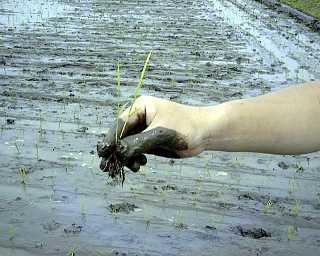 イネの苗はこうして持って植えていきます。指であなをあけて、その中に苗をおいてくるようにして植えます。 持ちきれない苗は腰のカゴの中に入れておきます。 |