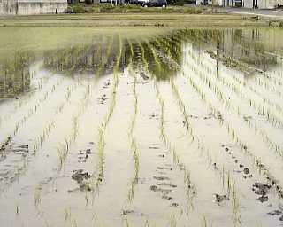 2列ずつ植えられているのがわかりますか? 植えたイネの間を歩いて進むのですが、これがまたむずかしいのです。足下をばかり見ていると田植機はクニャクニャいがんでしまいます。ぬかるんでいるたんぼの中を歩くのはなかなかたいへんです。 |