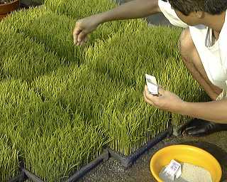 田植えをする前に苗の消毒をします。イモチ病などにきく薬をパラパラとふりかけています。 でも、あまり使いすぎると川に住む生物にわるい影響(えいきょう)がありますと書いてありました。 |