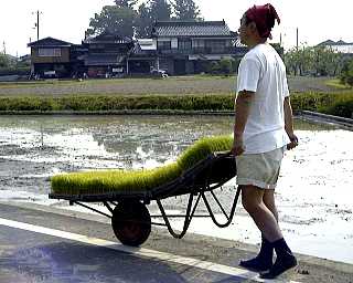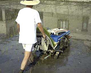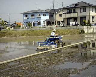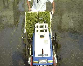 日曜日の朝は6時に起きて準備です。 さあ、いよいよ田植えです。 これは田植機で、2条(にじょう)植えといわれるタイプで、1回で2列ずつ植えられます。 |