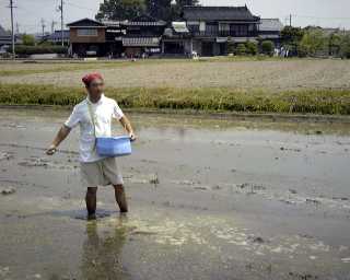 花さかじいさんではありません。(^O^) これは肥料をまいているところです。三色の肥料が入っていて、それぞれとける時期がちがっているので、イネの成長にあわせてきくそうです。まるで時計じかけのような肥料ですね。 |