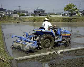 トラクターで「しろかき」をしています。土をほりおこして、全体を平らにしていきます。 このあとトンボ(グランド整備などに使う道具)を使って手作業でさらに平らにしていきます。この作業がまたたいへんなのです。 |